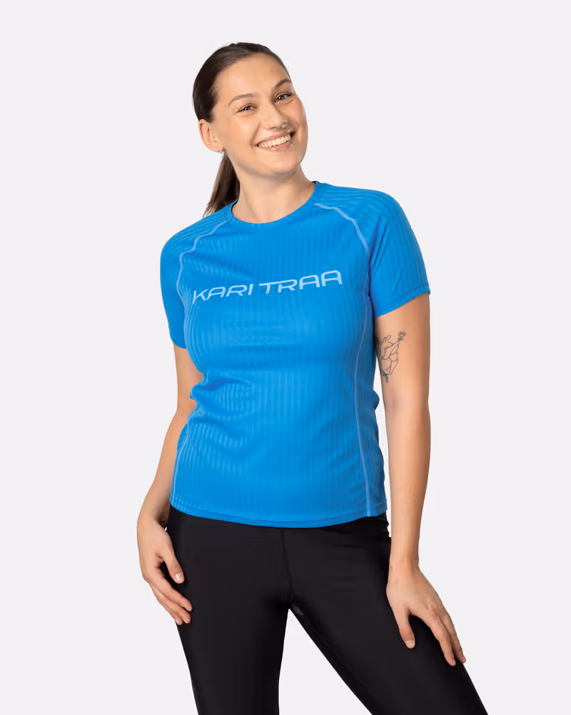 The Ella Tee is a lightweight, ribbed performance short sleeve top featuring bright, colorblocking styles. Bright bold colors and contrasting Kari Traa chest logo make this a fun, feminine top for a variety of active endeavors.