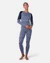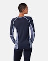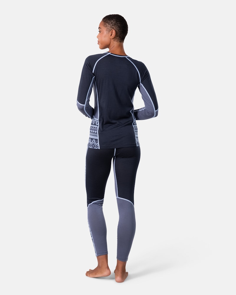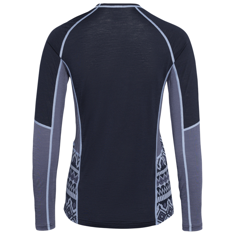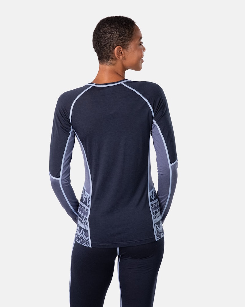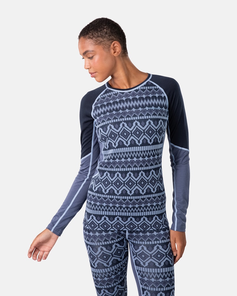 The Malia Long Sleeve is a slim-fit base layer blending Merino wool and Tencel for warmth, quick drying, and comfort, featuring a stylish jacquard knit.