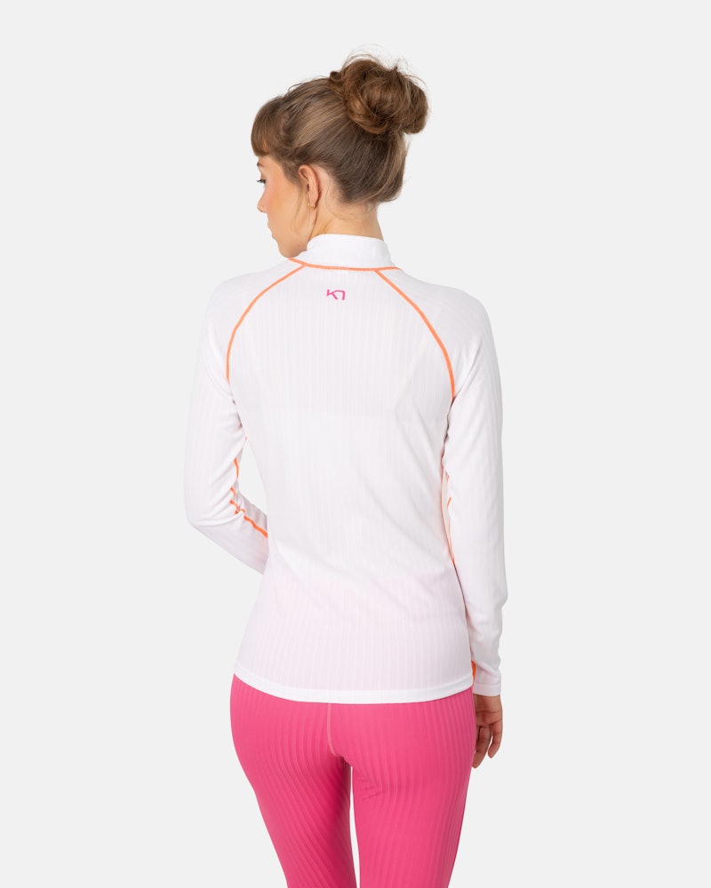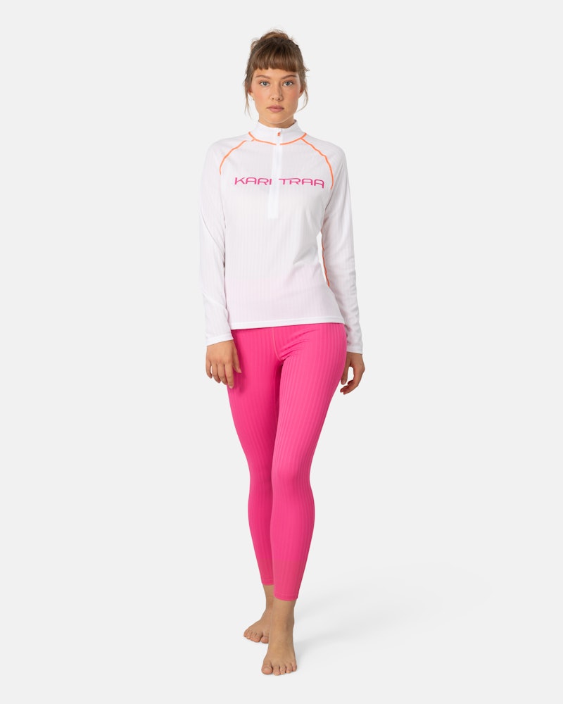 The Ella Half Zip is a lightweight, ribbed performance top featuring bright, colorblocking styles. The functional half zip allows you to customize ventilation for any high effort actvity or variable weather. Bright bold colors and contrasting Kari Traa chest logo make this a fun, feminine top for a variety of active endeavors.