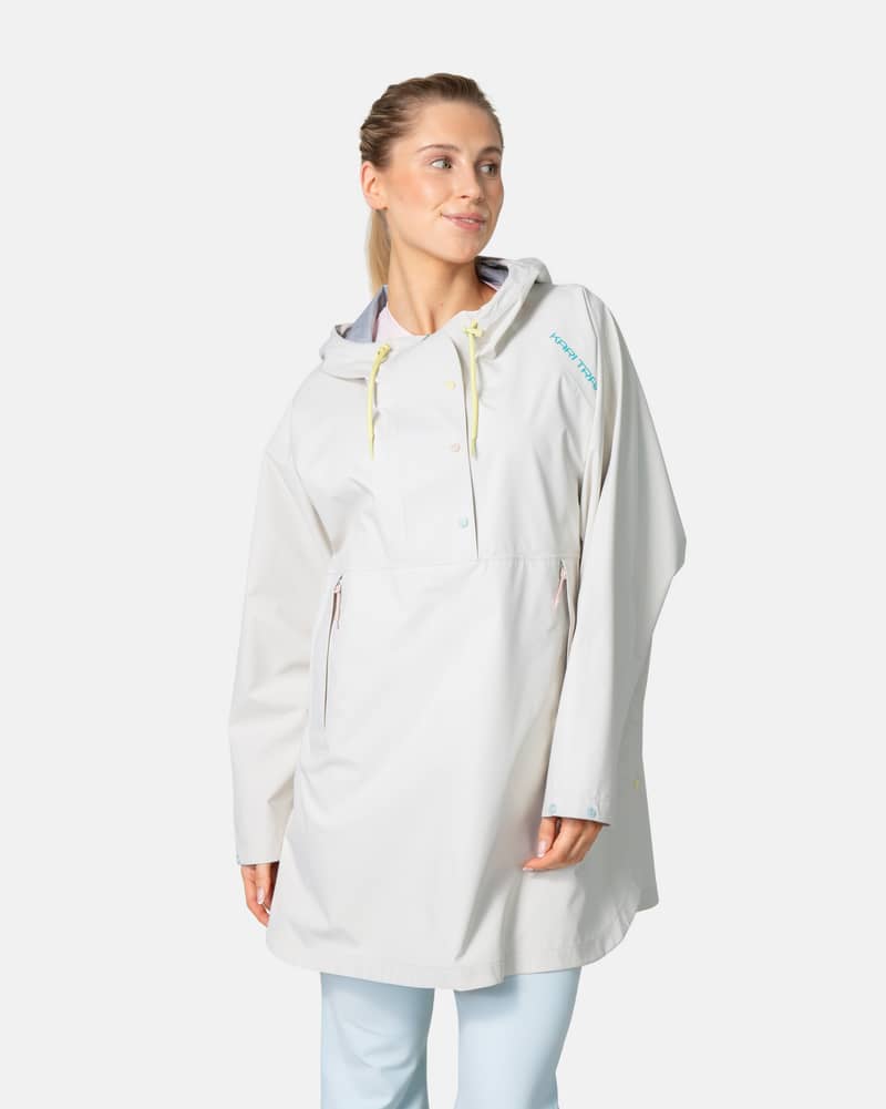 • Never fear getting caught in the rain with the Thea Cape. This loose-fitting anorak with expandable neck opening, side slits, and snap button adjustable cuffs can easily layer over your outfit for ultimate weather protection.