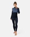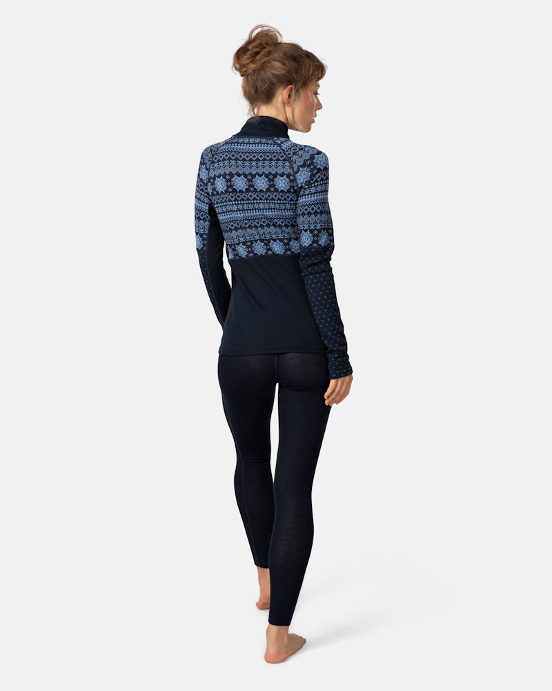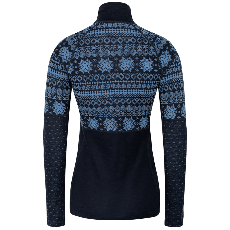 Stay warm and move freely in the Vilma Half Zip, a 100% merino wool base layer designed with a unique snowflake pattern, stretchy panels, and adjustable zip neck.
